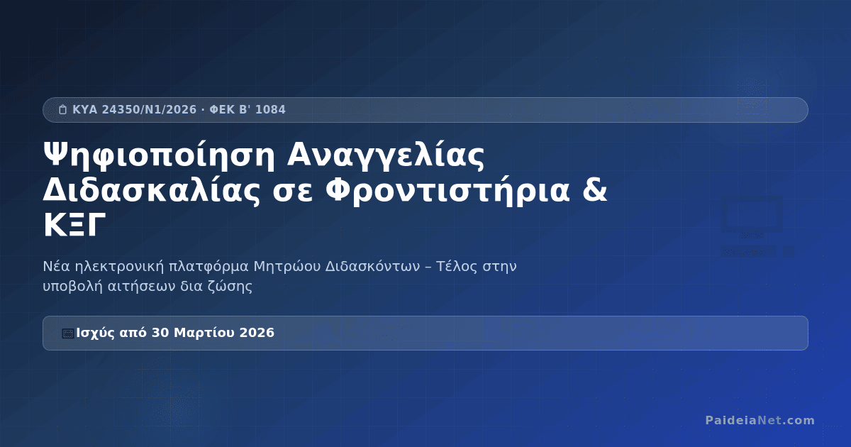 Με την ΚΥΑ 24350/Ν1/27-02-2026 (ΦΕΚ Β’ 1084), που υπογράφεται από την Υπουργό Παιδείας Σοφία Ζαχαράκη και τον Υπουργό Ψηφιακής Διακυβέρνησης Δημήτριο Παπαστεργίου, ψηφιοποιείται πλήρως η διαδικασία αναγγελίας έναρξης άσκησης του επαγγέλματος της διδασκαλίας.