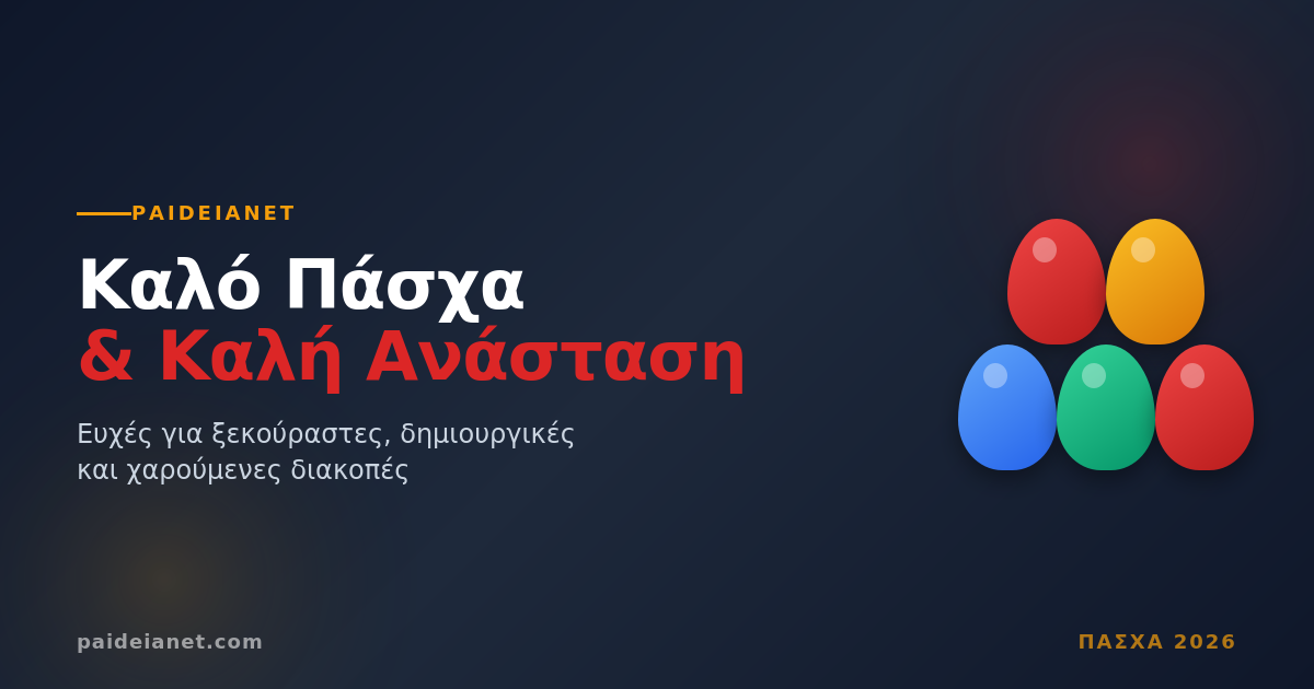Καθώς οι Άγιες Ημέρες πλησιάζουν, το PaideiaNet εύχεται σε όλους τους μαθητές, τους γονείς και τους εκπαιδευτικούς ένα Πάσχα γεμάτο γαλήνη, ξεκούραση και χαρούμενες στιγμές με τους αγαπημένους τους.