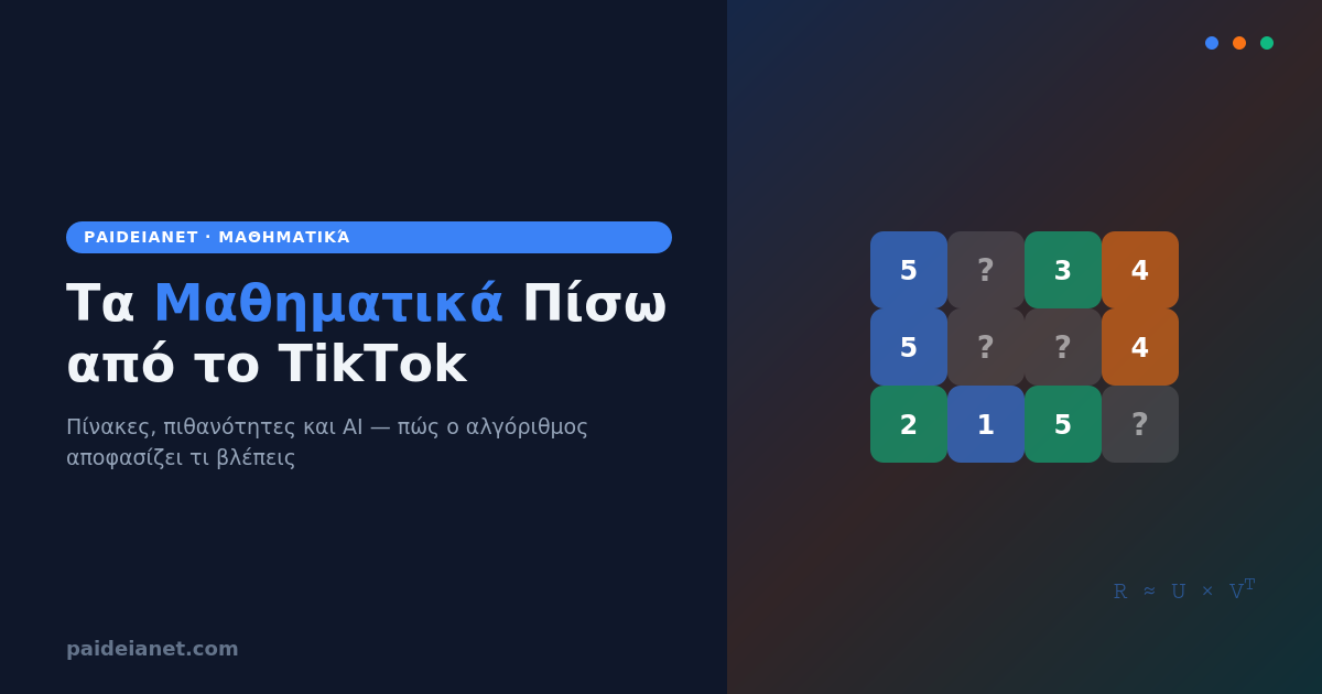 Ανοίγεις το TikTok. Σκρολάρεις. Πέντε λεπτά γίνονται σαράντα. Κάθε βίντεο μοιάζει σαν να είναι φτιαγμένο ειδικά για σένα. Τυχαίο; Καθόλου. Πίσω από κάθε πρόταση βίντεο κρύβονται μαθηματικά — και μάλιστα από αυτά που διδάσκονται στο σχολείο.
