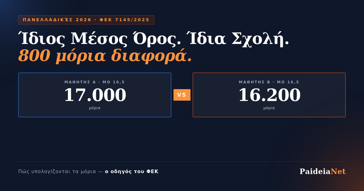 Ο Μαθητής Α και ο Μαθητής Β έχουν Μ.Ο. 16,5. Συγκεντρώνουν 800 μόρια διαφορά στην ίδια σχολή.