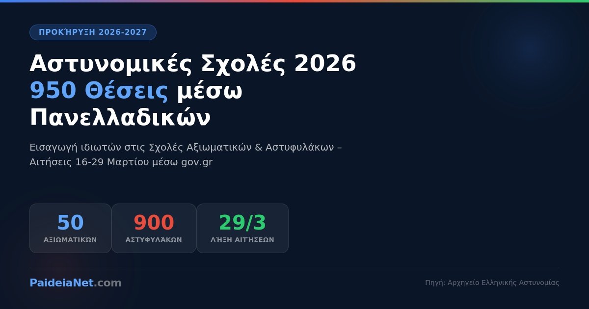 Η προκήρυξη εκδόθηκε στις 13 Μαρτίου 2026 από το Αρχηγείο Ελληνικής Αστυνομίας (Γενική Διεύθυνση Διαχείρισης Ανθρώπινου Δυναμικού) και αφορά συνολικά 950 θέσεις: 50 στη Σχολή Αξιωματικών και 900 στη Σχολή Αστυφυλάκων.