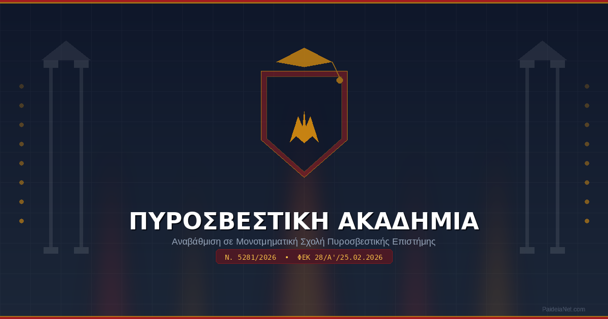 Με τον Νόμο 5281/2026 (ΦΕΚ 28/Α’/25.02.2026), με τίτλο «Ενεργή μάχη: Ολοκληρωμένη αναμόρφωση του συστήματος πρόληψης, ετοιμότητας και απόκρισης έναντι δασικών πυρκαγιών…», η Πυροσβεστική Ακαδημία υφίσταται την πιο ριζική αναδιάρθρωση στην ιστορία της.